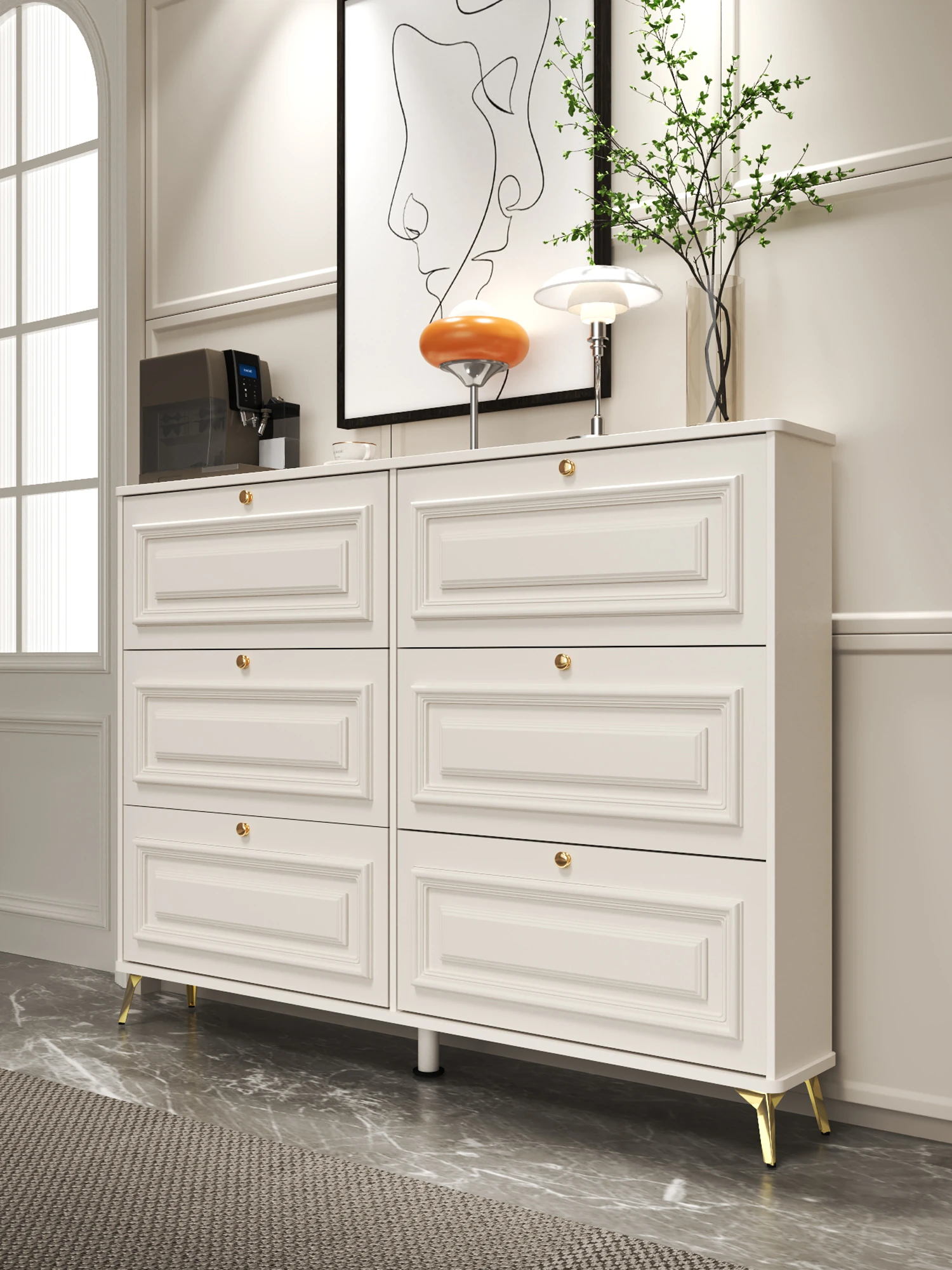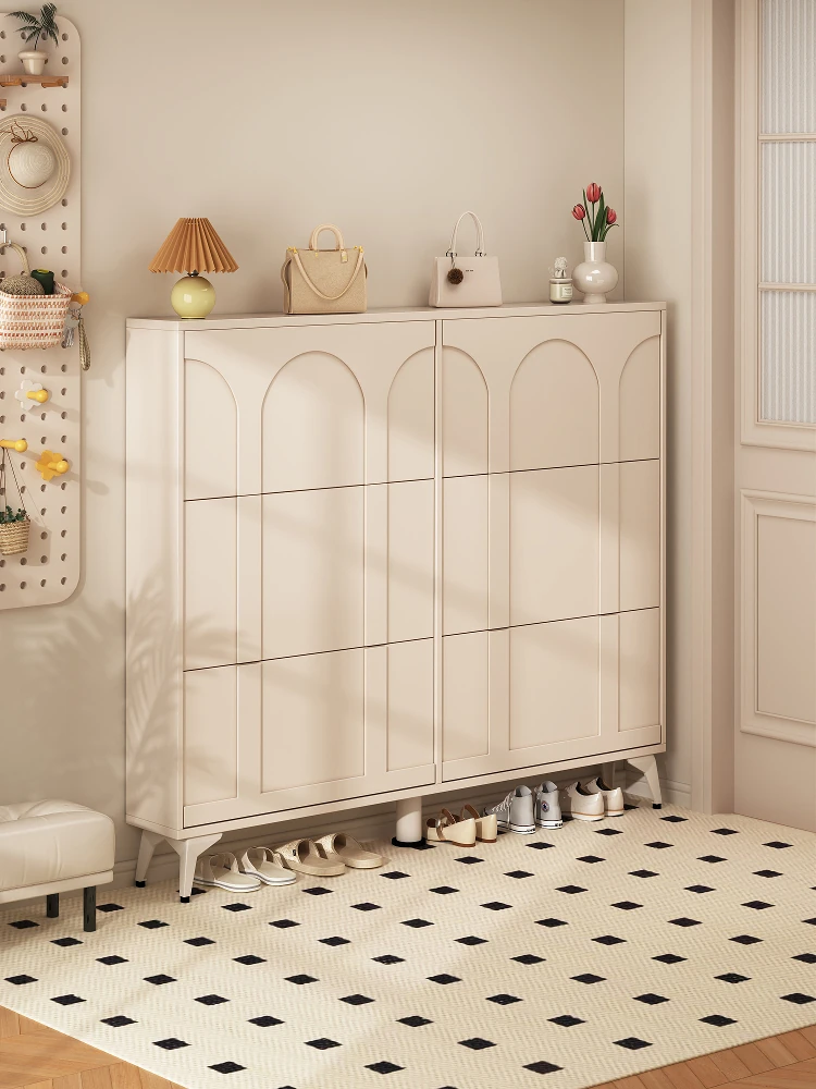 超薄デザインのスリムシューズキャビネット!家庭用玄関収納に最適な2025年新作、クリーム風のスタイリッシュな靴ラック。狭いスペースにもフィットし、すっきりとした玄関を演出します!