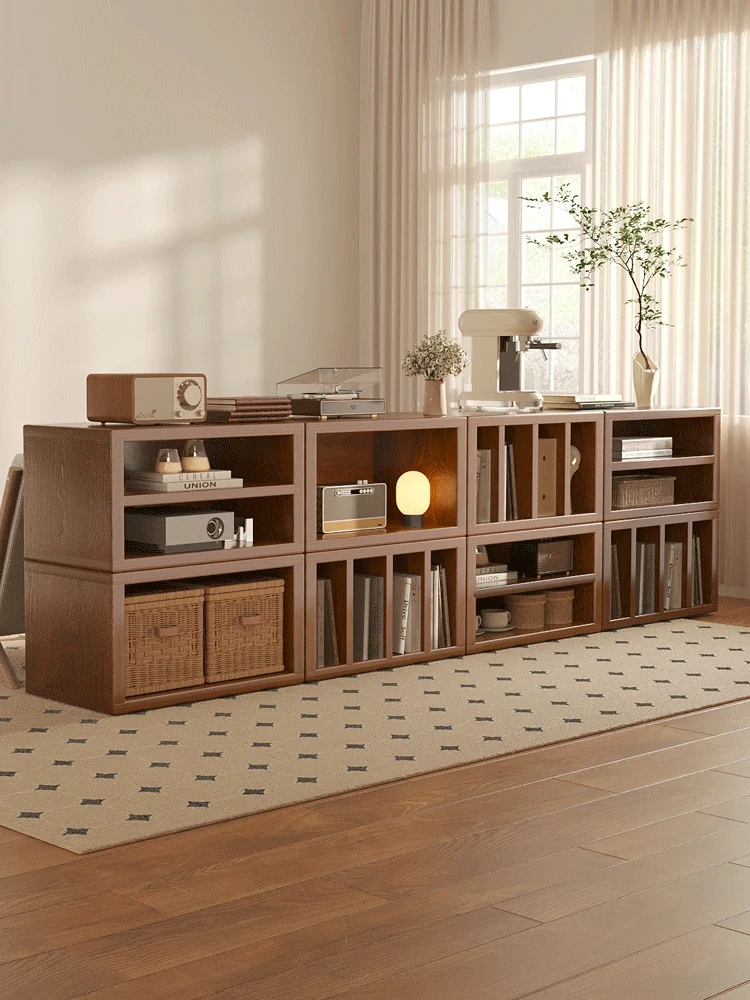 ウォールナット色の天然木格子キャビネット - 自由に組み合わせ可能な書棚とテレビ台!リビングルームの仕切りとして最適な収納力を持つスタイリッシュなデザイン。おしゃれに整理整頓して、あなたの空間を素敵に演出します!