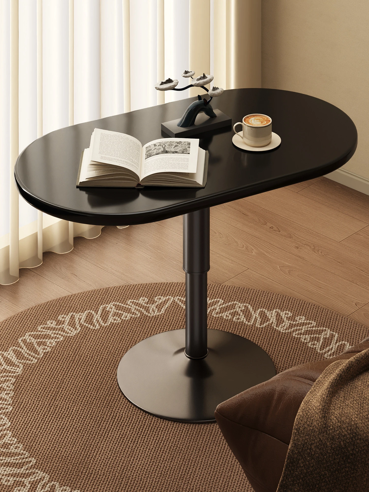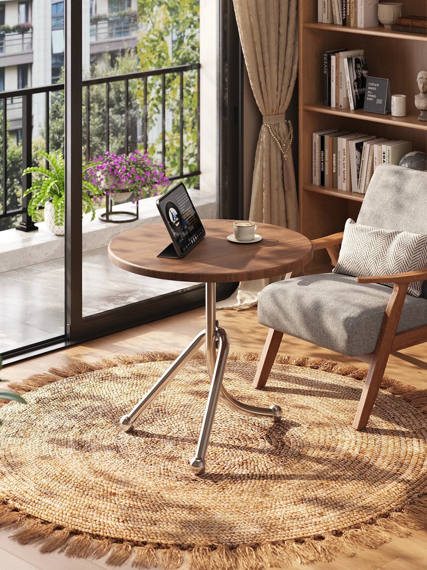 北欧スタイルのミニマルなリビング用ラウンドテーブル - おしゃれなバルコニーでの食事やティータイムにぴったり!小型住宅に最適な洗練されたデザインで、軽やかな雰囲気を演出します。