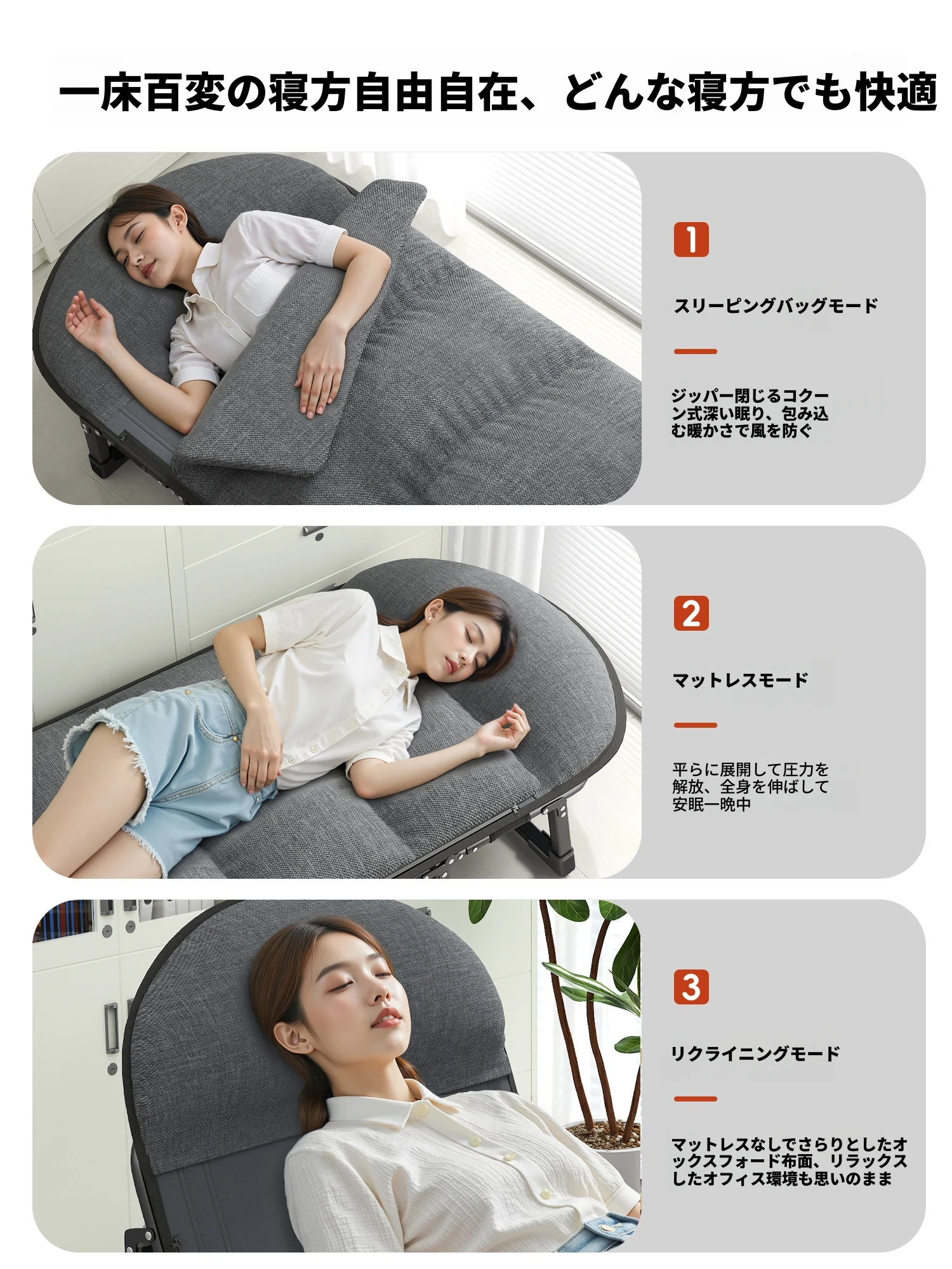 オフィスでの昼寝に最適!折りたたみ一人用ベッド・リクライニングチェア。快適な昼寝を実現する便利なポータブルキャンプベッド。あなたの仕事場に最適な睡眠アイテム!