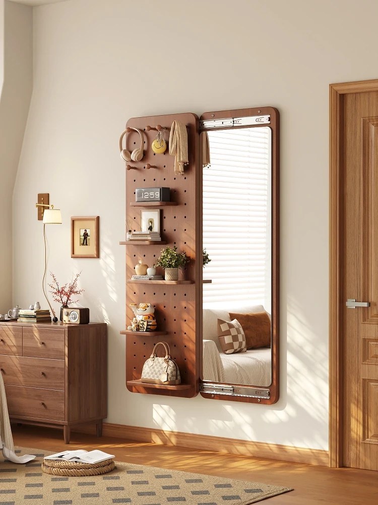 無垢材使用の隠れた全身鏡!玄関に最適なスライド式ミラー、使わない時はすっきり収納。おしゃれな試着スペースを演出し、空間を有効活用!