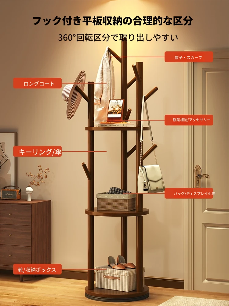 天然木製の回転式コートハンガー - おしゃれで実用的なフロアスタンド衣類ラック。寝室やリビングに最適、衣類を美しく整理してスタイルアップ!