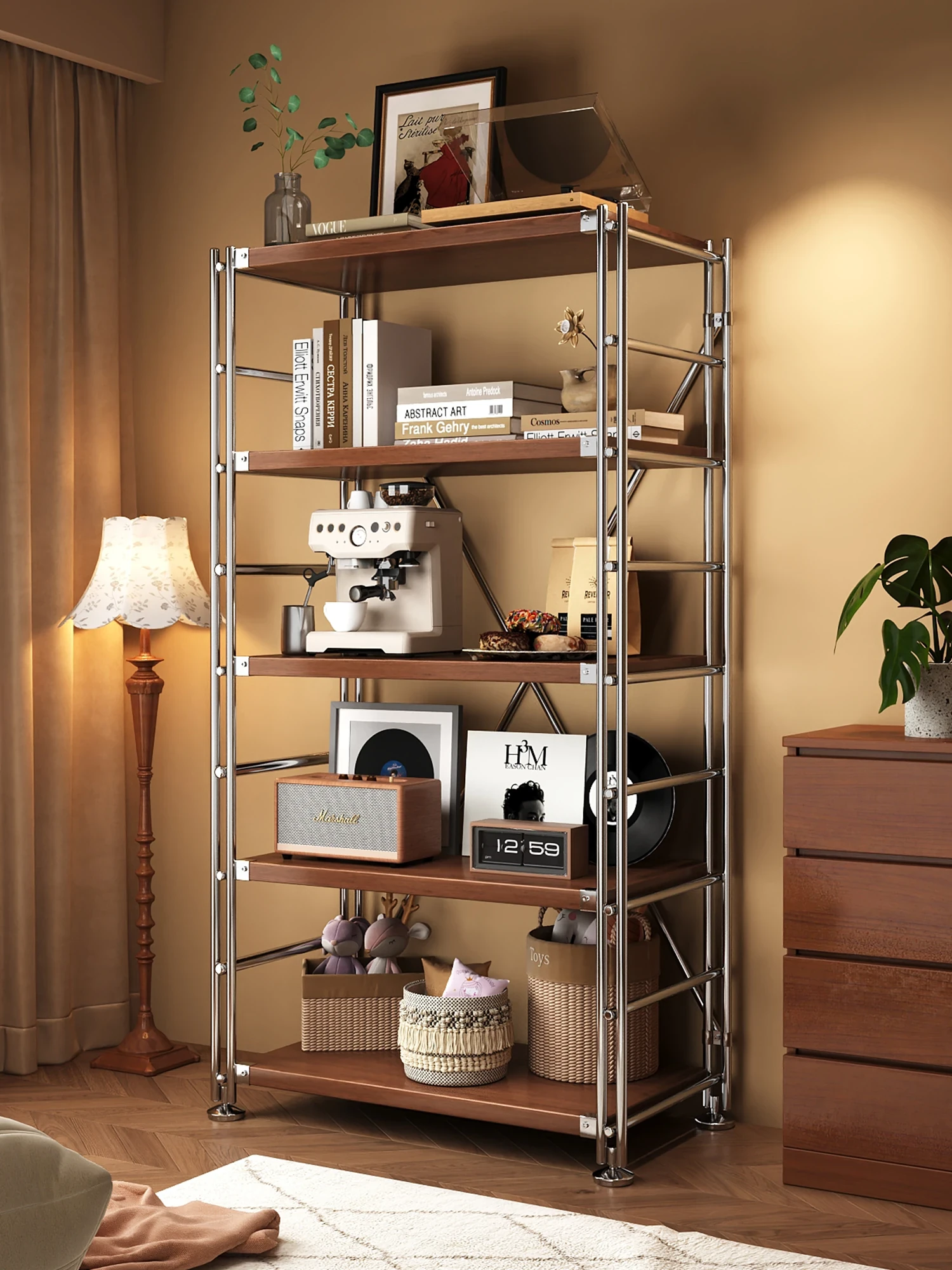 レトロスタイルの無垢材書棚 - おしゃれな収納ラック、リビングに最適なフロアスタンド式のディスプレイキャビネット!本や小物を美しく収納し、空間を素敵に演出します。